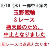 本日の玉野競輪8レースは悪天候の影響で中止となりました。 ご迷惑をお掛けしますがご了承ください。