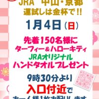 1月4日(日)9時30分より 入口付近にて JRAのオリジナルハンドタオルを先着プレゼント致します。 詳しくは …