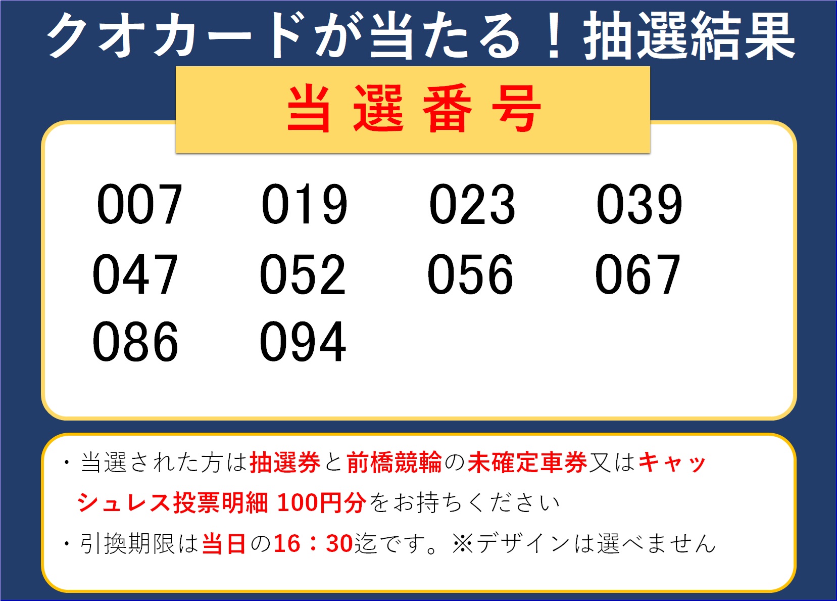 競輪オリジナルクオカードが当たる!! 当選番号発表!!
