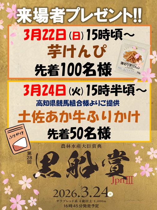 22日(日) 芋けんぴ 24日(火) 高知県競馬組合様ご提供 土佐あかうしふりかけ 各日先着でプレゼントいたします。