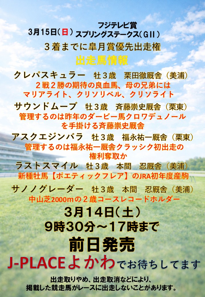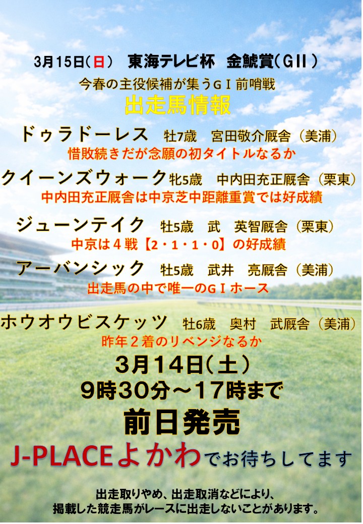 3月15日(日)はJRA重賞レースの発売日です。 前日発売も14日(土)17時までJ-PLACEよかわにて馬券をお求めいただけます。皆さまのご利用を心よりお待ちしております。